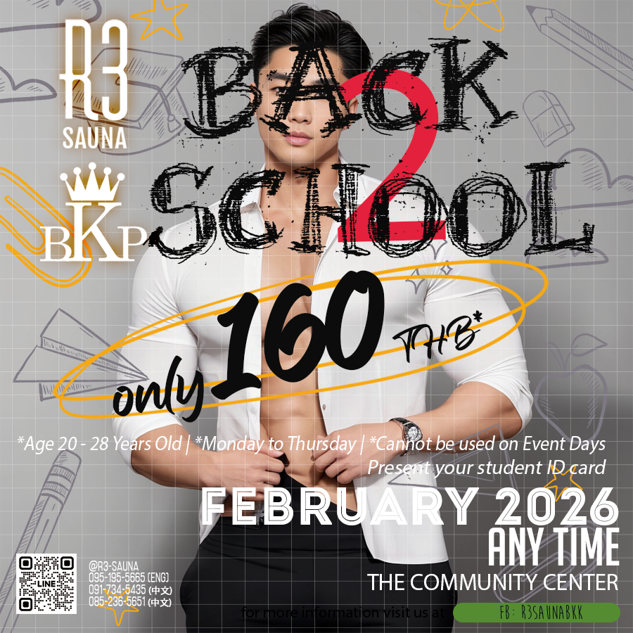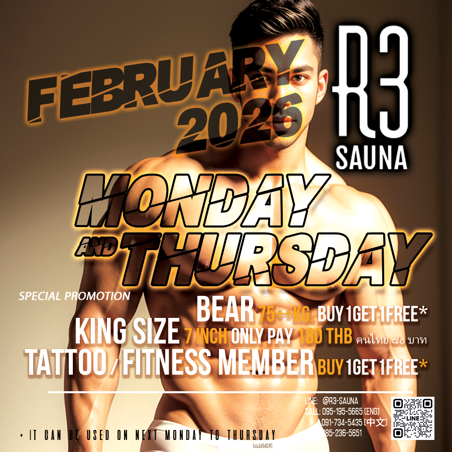 Welcome to R3 Sauna, the modern luxury place for guys like us. We have redefined a traditional guy sauna business into the center of today's gay community for all seasons, located on Ratchada Soi3 in Bangkok's bustling business district and the ex-pat residential area "Ratchada - Phraram 9". Here is a paradise for party lovers who love to have fun, a collection of all guys' Sauna, focusing on weekend gatherings and relaxing by onsen events with Thai, foreign and Chinese customers.