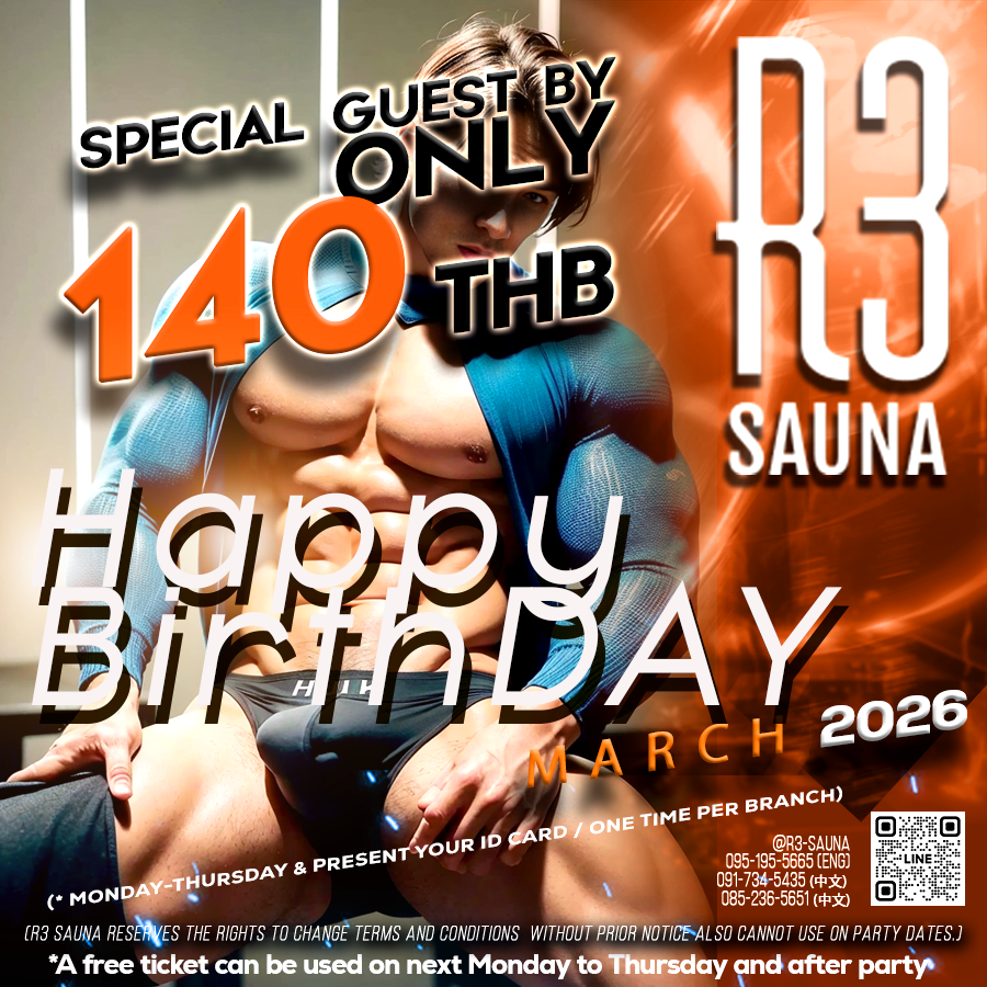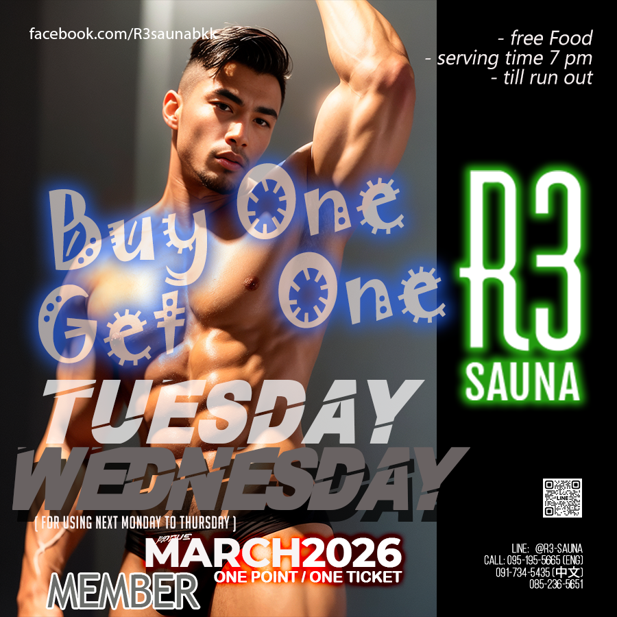 Welcome to R3 Sauna, the modern luxury place for guys like us. We have redefined a traditional guy sauna business into the center of today's gay community for all seasons, located on Ratchada Soi3 in Bangkok's bustling business district and the ex-pat residential area "Ratchada - Phraram 9". Here is a paradise for party lovers who love to have fun, a collection of all guys' Sauna, focusing on weekend gatherings and relaxing by onsen events with Thai, foreign and Chinese customers.